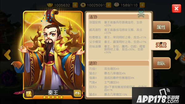 作为一国之君,秦王的连协技和进阶技能也相当实用,增加自身回血的光环技能极为出彩。加血加防的技能也很好的保证了秦王能够在场上长时间存在。