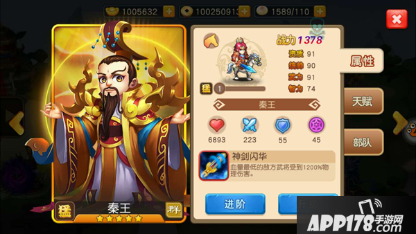 秦惠文王重用张仪连横破合纵,是他一生中最大的亮点。对张仪,赢驷求之,试之,任之,信之。在秦与到列国间复杂的邦交斗争中,多次逆转危势,击溃五国灭秦之兵。继孝公用商鞅之后谱写了又一页君臣合璧华彩篇章。秦王作为一个猛将型的武将绝对不容小觑。从星级上可以看出,秦王作为一个5星武将,战力达到了1378。资质则是达到了91点,其他三围属性中武力值达到了91,非常符合一个皇帝的身份