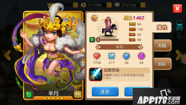 芈月作为5星武将,资质94,统帅达到100,武力则弱些只有54,但智力88,初始战力1462。