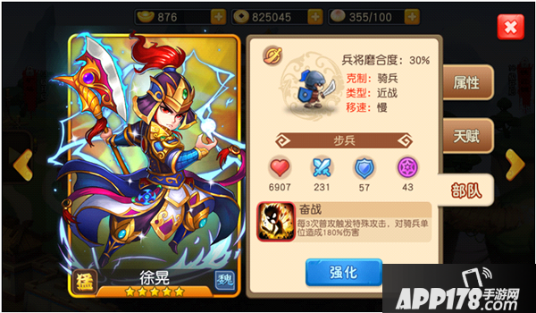 徐晃所带领的兵种是克制骑兵的步兵,可以拦截敌方骑兵队己方后排的突进,作为前排,配合其高伤害高血量的特点,能有效的将敌方骑兵斩杀与阵前。