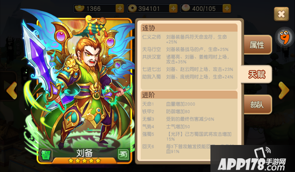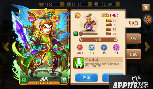 刘备能从三国众多英雄中脱颖而出,成就不世霸业。这就很能说明问题,刘备作为一个智力型的武将绝对不容小觑。从星级上可以看出,刘备作为一个5星武将,战力达到了1484。资质则是达到了94点,其他三围属性中统帅值达到了99,非常符合一个皇帝的身份