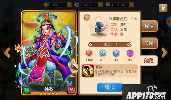 孙权所带领的兵种也是克制骑兵的步兵,综上所述,孙权同样也是一个属于冲锋领兵,耐揍抗打的英雄。在战场前排起到不容忽视的作用。