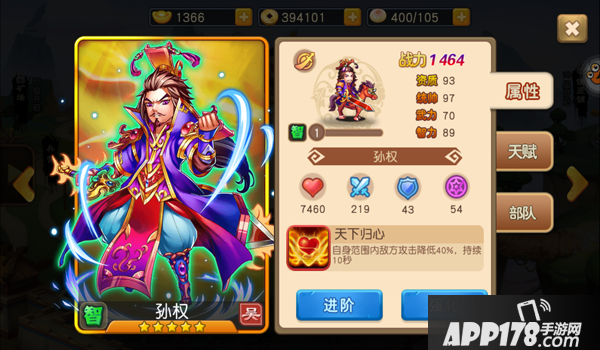 本作中,孙权同样也是一个智力型5星武将,初始战斗力达到了1438。资质达到了93点,统帅达到了97点,智力也达到了89点。大大保证了其血量与魔法抗性。