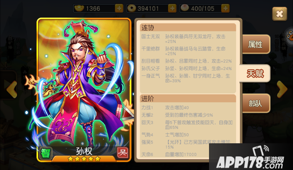 作为三国时期东吴开国皇帝,孙权的连协技能和进阶技能同样也是相当给力,增加吴国武将攻击,提高自身血量,防御,攻击,大大提升全套吴国阵容的可玩性。