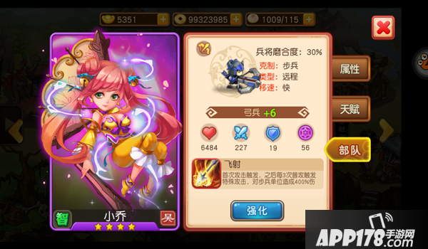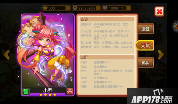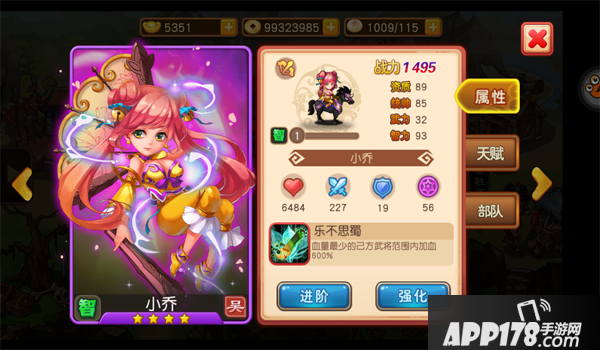 从获得的基本资讯上来看,小乔属于智力型武将,并且从星级上可以看出,小乔作为一个4星武将,各项初始属性都不弱,作为判断武将实力最重要的战力达到了1495。资质则是达到了89点,甚至智力已经超过了90点。
