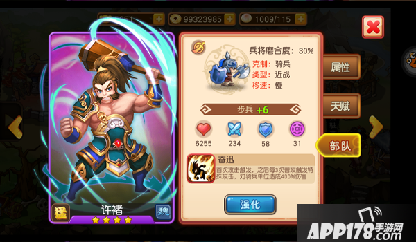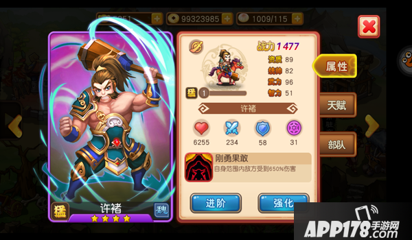 许褚属于勇猛型武将,并且从星级上可以看出,许褚作为一个4星武将,判断武将实力最重要的战力达到了1477。资质则是达到了89点,甚至武力则是达到了96点。攻击力不容小觑