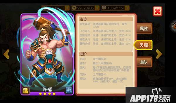 许褚的连协技和相关的进阶技能都是一些加攻加血的技能相当的实用,