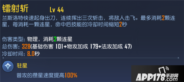 镭射斩的第一个天赋,简直就是神天赋,攒星加100%,这个天赋可以让骑士在2秒内就可以攒满5星。当然,这个技能的伤害是一般般啦,毕竟CD也短,在有连星的情况下,基本上就是4秒CD。