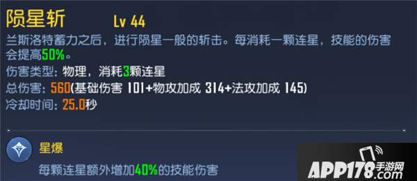 这个技能自身消耗星数提高的伤害比例和天赋耗星提高伤害比例加一起,可以增加270%的伤害,这是很夸张的,算是骑士伤害最高的技能了吧。所以这一次建议大家玩骑士的可以这样搭配技能:镭射斩+雷星斩+陨星斩。这三个技能是手动操作能打出最高爆发最高伤害的技能搭配。