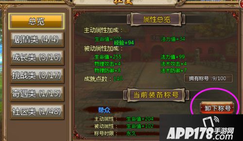 看到称号界面,您会看到一个【卸下称号】的字眼,点击【卸下称号】,然后点击左边的总览,挑选您认为符合您当前的最酷炫的称号,装备上即可。