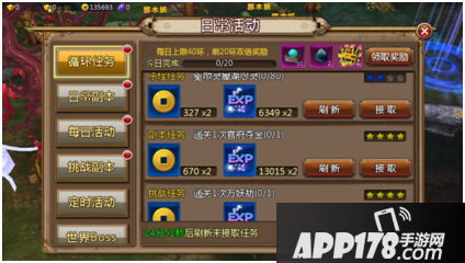 副本、装备强化、培养、挑战等等。每个任务完成有一定的金币、经验及帮贡奖励。