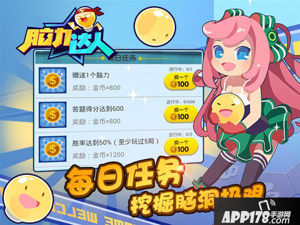 在游戏的任务界面就可以看到“每日任务”啦~!(☆_☆)任务每天会随机刷新五个,玩家达到相应的任务要求后即可获得丰富奖励。每日任务在任务系统中的一大特点是,当其中某一个或某几个任务不符合你的游戏体验要求时,可以花费游戏币“换一个”,在这个不缺钱的世界中尽情体验土豪的感觉!另一大亮点就是奖励丰厚,每天玩家都可以完成任务获得金币、经验卡、脑力甚至钻石等珍贵奖励,收到手软的节奏啊!自从小编开始完成每日任务,就发现自己的脑洞潜力无限,答题的时候再也不用求助身边的小伙伴了!