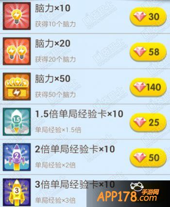 商城各道具价格如图所示,脑力*10=30钻石(单价:脑力*1=3钻石),脑力*20=58钻石(单价:脑力*1=2.9钻石),脑力*50=140钻石(单价:脑力*1=2.8钻石),1.5倍单局经验卡*10=25钻石(单价:1.5倍单局经验卡*1=2.5钻石),2倍单局经验卡*10=50钻石(单价:2倍单局经验卡*1=5钻石),3倍单局经验卡*10=100钻石(单价:3倍单局经验卡*1=10钻石)。