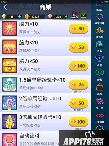3、自动答题。小编个人觉得自动答题这个,如果你只是想智商榜排名靠前一点,可以用,但是这样失去了很多答题的乐趣,而且,一次20太贵了。如果你不是土豪,不推荐用这个。但是如果是一答到底的话,前期答了几十道题,差一点就100了,这种情况,还是果断的用了吧。