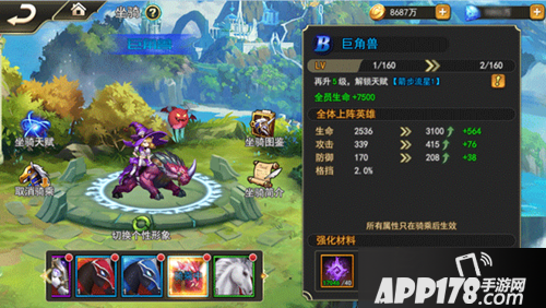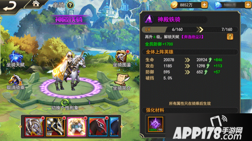 坐骑系统解锁之后,玩家实力的提升与坐骑息息相关。玩家通过激活坐骑不同条目的天赋,可以获得相应属性的加成;通过消耗金币和对应资源可以提升坐骑强化等级,可以提高坐骑的属性及强化天赋,佩戴或卸下坐骑,即有对应属性的增减;激活相应坐骑图鉴,亦可增加上阵英雄属性。