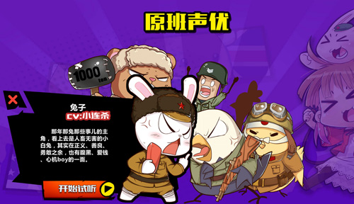由动漫《那年那兔那些事》原班人马配音已经成了《那兔之大国梦》手游里面重要的艺术元素之一。游戏中,不同性格的游戏人物搭配不同的声音,无论从音色、音质还是力度都拿捏到位,更凸显角色的个性特点,让亲们在游戏时代入感十足。为了让亲们更近距离亲近这些声音,同时也为了让亲们更加深入了解游戏角色,我们将于3月15日在微信上开启配音票选活动。亲们快来围观,为你最喜爱的配音投票吧!