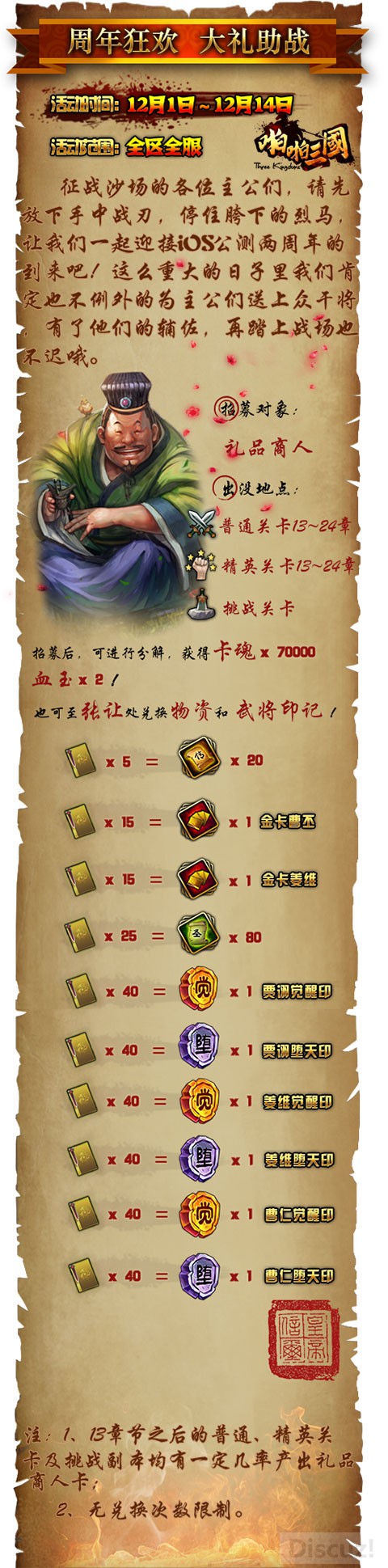 1、普通、精英关卡13章节之后与挑战副本有一定几率产出礼品商人卡;