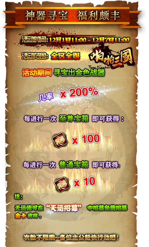 活动期间内寻宝出金武器几率*200%!并且每进行一次普通宝箱寻宝,将获得10点天运值,每进行一次至尊宝箱寻宝,将获得100点天运值。次数不限哦~各位主公赶快行动吧!