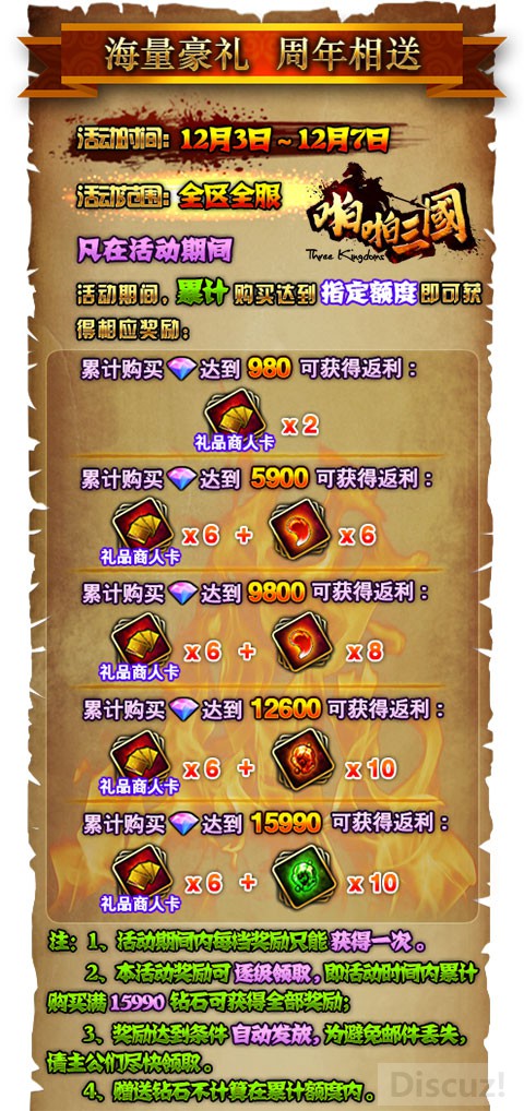 2、 活动奖励为逐级领取,累计充值满15990钻石可获得所有奖励;