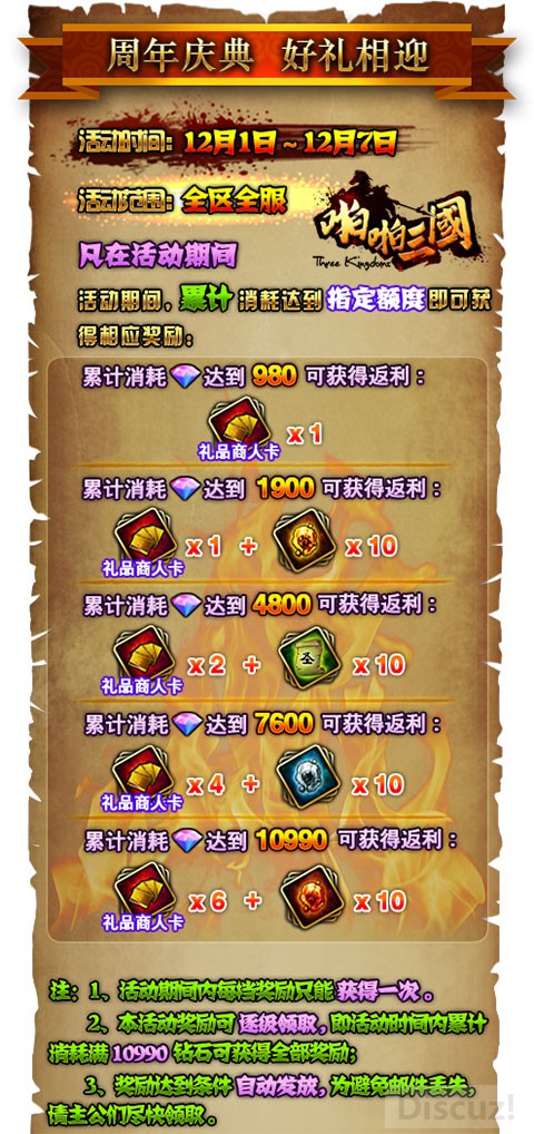 2、 活动奖励为逐级领取,累计消耗满10990钻石可获得所有奖励;