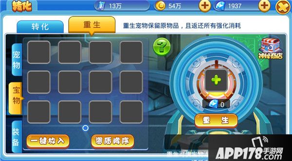 重生宝物保留原物品但会将宝物退回到原始状态可使宝物回到初始状态,并返还所有培养消耗,资质高的宝物重生需要消耗一定钻石;点击一键放入系统会自动将宝物栏中的宝物放至右方重生栏中,点击重生即可,重生后返还的培养消耗可用于其它宝物使用