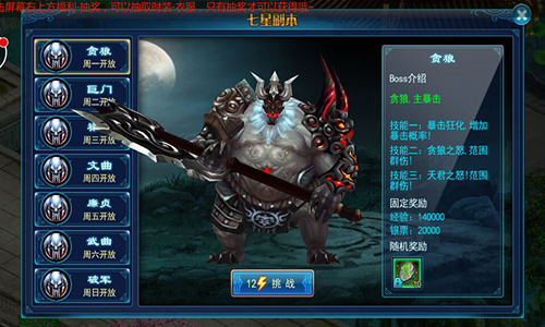 参加无限挑战,每天上线,把七星副本刷一遍,根据天罡七星就是北斗七星命名,每天一个不同的任务副本,每日一次,消耗体力12点, 固定奖励经验14W 和银票2W,剩余的奖励则不同。