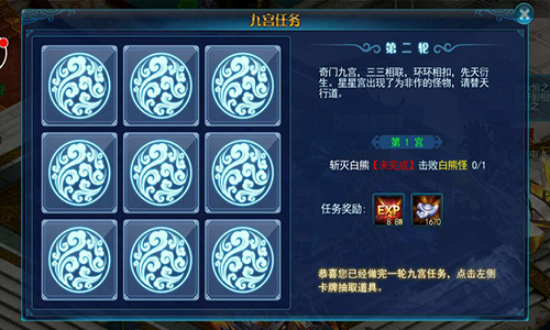 完成九宫任务,还可以达成成就,完成九个任务之后,玩家可以随机的选择三个牌子,点开即可获得相应的奖励,每一轮的经验奖励也不同,轮数提升相应的银子也不同。