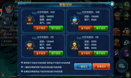 资源找回分为四种,不同的任务,可以直接完成,只要你有足够的金子和银子,还有强大的思考大脑。很多人说我有钱就是任性,把任务都做了。我们先来看看任务不同的奖励程度和消耗度,每个任务所消耗的银子和金子各不相同,尽可能把高经验的先做了,小编没钱挥霍不起,先来个小额的,嘿嘿!升级了。接下去该怎么做,想必大家都清楚了,要记住一点,没钱的话你可以充值金子兑换银子,因为成比例的返还的。