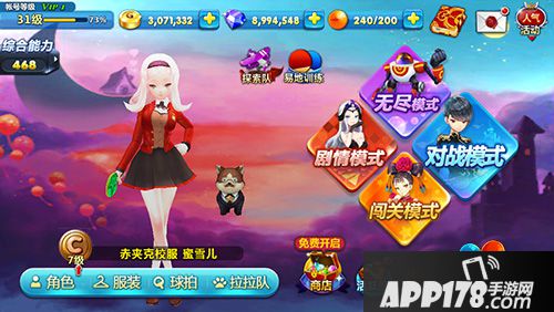 在主界面的左侧我们发现一名漂亮的小姑娘和身后西装笔挺的短尾猫,没错那就是你!你可以通过角色、服装、球拍、拉拉队这四个选项来改变自己的形象提升你战斗力,绝对是一件又开怀又有成就感的事,难道不是吗?