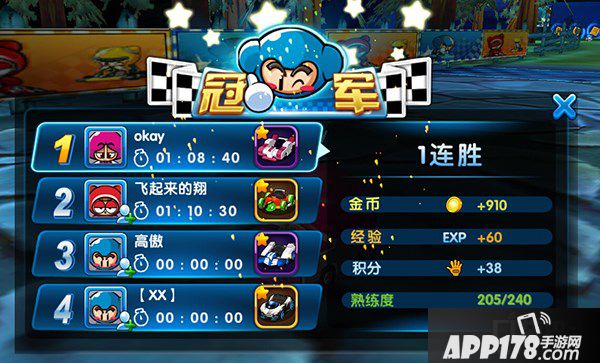 玩家取得个人道具胜利,会获得金币、经验、赛车熟练度和手套积分。玩家通过手套积分的累计,可以获得排行奖励。
