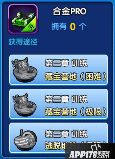 a.通过合金PRO券合成,需要30个。合金PRO券有几率通过以下关卡获得:第三章训练-藏宝营地(困难);第三章训练-藏宝营地(极限);第三章训练-逃脱地铁(极限)