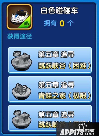 a.通过白色碰碰车券合成,白色碰碰车券需要300个,白色碰碰车券获得关卡:第五章追寻-跳跃峡谷(困难),第五章追寻-青蛙之家(极限),第五章追寻-跳跃峡谷(极限)