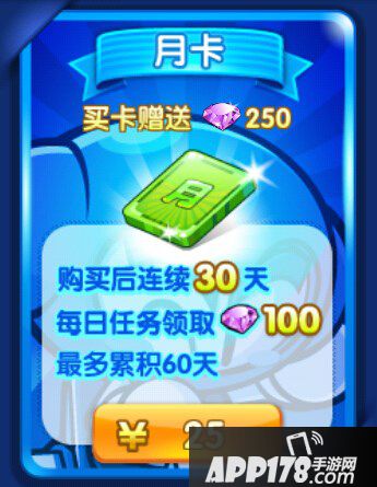 普通月卡的价格是25元。买卡赠送250钻石,购买后连续30天,每日任务领取100钻石。普通月卡最多累计60天。
