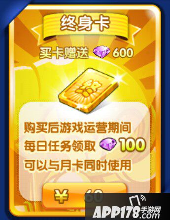 终身卡的价格是60元。买卡赠送600钻石,购买后游戏运营期间每日任务领取100钻石。可以与月卡同时使用。