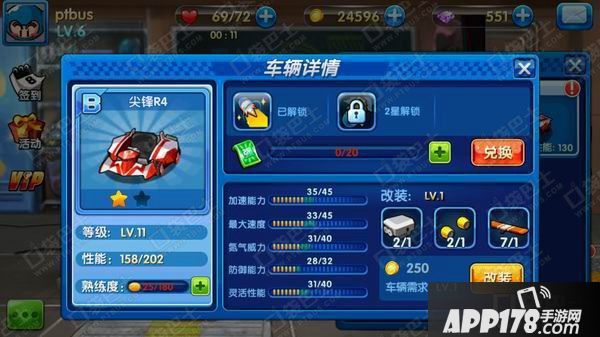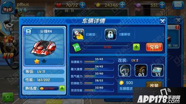 改装后玩家赛车的属性将会得到略微提升,不过与升星不同,一辆赛车可以进行多次改装,改装次数越多,车辆的属性越高(受车辆最高属性限制)本次口袋小编用自己的尖锋R4来举例说明一下(你们不要笑话我,由于内测数据被删,公测后这两尖锋R4还是免费紫色齿轮抽的呢……)
