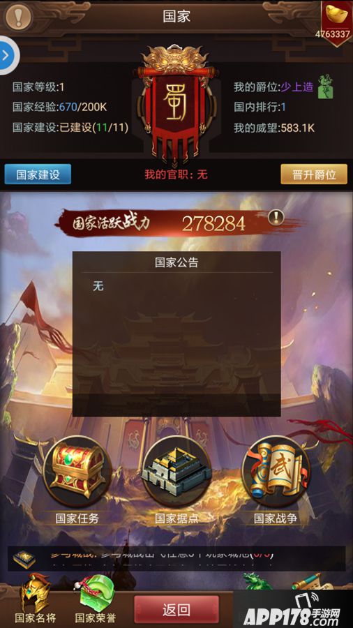 3.爵位需要消耗一定的威望和材料来晋升。威望通过参与国战、攻打其他国家主公来获得。
