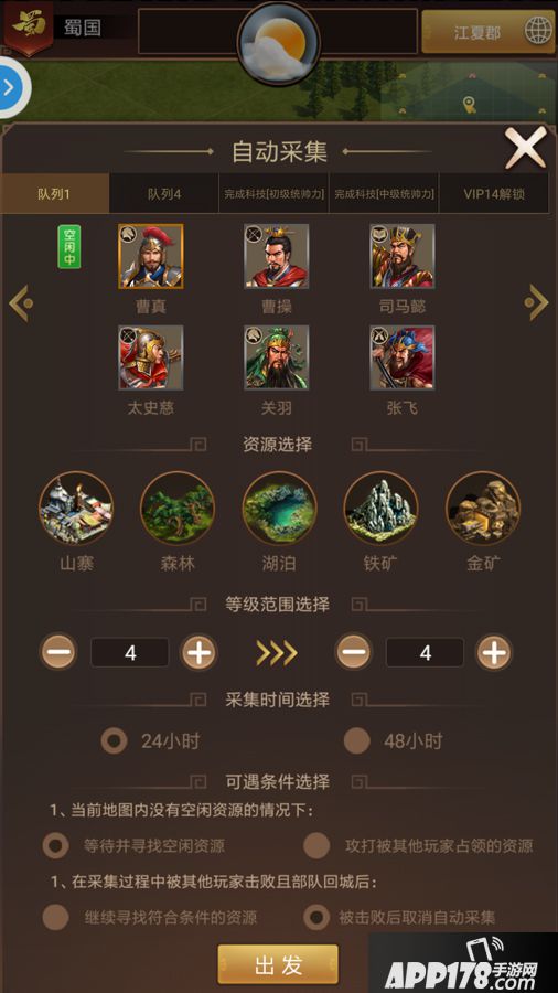 3.同一个资源田只能派遣一位武将前往采集,采集中的资源田其他主公可以进行抢夺,抢夺成功后归属新的主公所有。