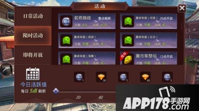 主公大人想要更多的军队和粮草资源,那就要多多参加游戏里的活动了,参加活动后会获得相应的活跃值,活跃值达到一定值时就会有对应的奖励可以领取了;银币可以进行普通武将招募,但是普通招募会给5点的天运值,达到100天运就可以进行天运招募了,必得四星武将!一天最基本的活跃值就能得到6个银币,也就是30点天运,算下来一周就可以得到两个四星武将了,主公大人万万不能错过呀!