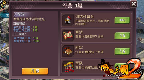 用于训练士兵、配置部队、设定驻守防御部队、查看军情等。