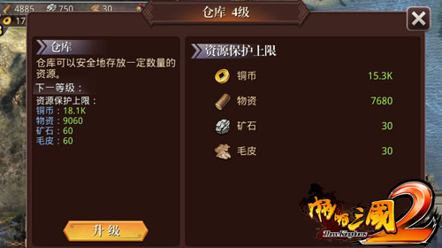 顾名思义,影响铜币、物资、矿石、毛皮4大资源的上限。仓库级别越高,能够储存的资源量就越多。