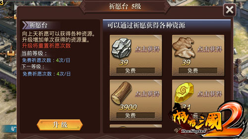 4种资源获得的不平均,就差1点矿石不能建造新的建筑怎么破?这时候祈愿台的作用就非常重要了。祈愿台每天都有4次免费的机会让玩家获得4种资源中的一种。千万不要错过呦~另外,升级祈愿台还可以额外增加每天免费的祈愿次数。
