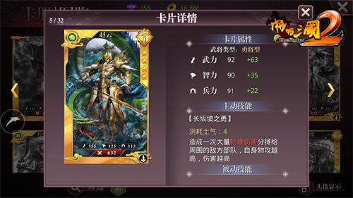 在《啪啪三国2》中,赵云手握龙胆亮银枪,他的枪法劲道飘逸,其武将技能“长坂坡之勇”造成一次大量物理伤害分摊给周围的敌方部队,自身物攻越高,伤害越高。面对千军万马亦可爆发潜能,有排山倒海之势。
