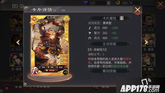 武力 689 智力 262 兵力 480 技能消耗士气3点,对自身周围的敌人造成大量物理伤害,自身物攻越高,伤害越高,并按照伤害一定比例回复自身血量 PS:以上数值及技能描述请以最终版本准备! |