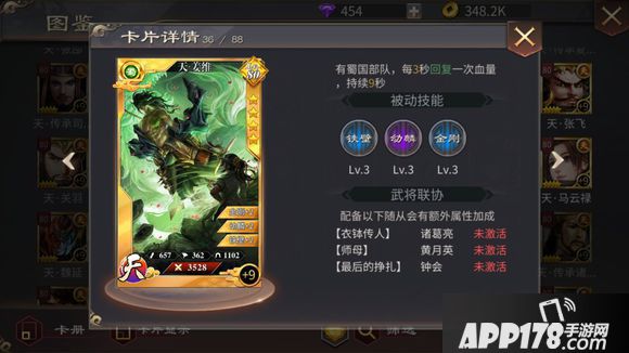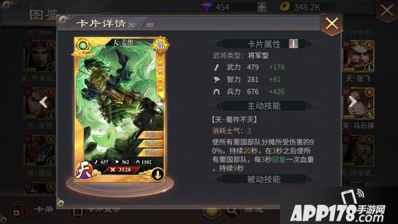主动技能消耗士气3点,使所有蜀国部队分摊所受伤害的90%,持续20秒,在3秒之后使所有蜀国部队,每3秒回复一次血量,持续9秒;