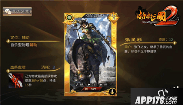 张星彩,张飞之女,继承了勇武的血脉,却也不乏冷静谨慎。在《啪啪三国2》中,张星彩的定位是自杀型物理辅助,大招“血祭虎啸”可提高己方物攻最高部队的物理攻击,随着自身生命值的减少可提升小幅物攻。