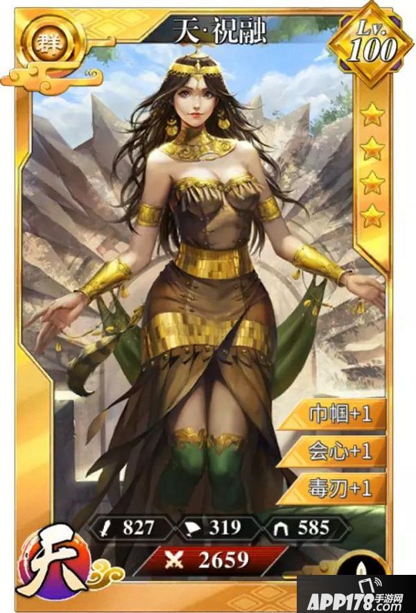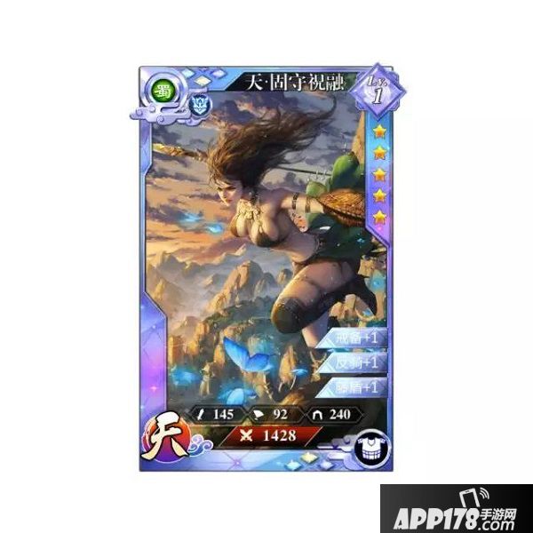 天·SR蛮神护体(2气):给己方策攻最高部队套上一个护盾,按照固守祝融兵力加成。护盾存在时,无法被击退,抓取和眩晕,持续15秒,护盾对同一个人不会叠加,会刷新最大护盾值