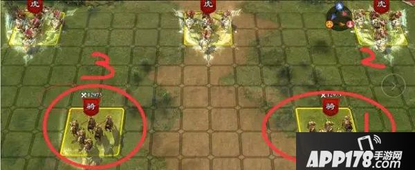 通过图片可以看出,关键点的两个骑兵中是右边的先放技能,中招是不可不免的。而左边的这个技能释放相对靠后,那么我们过关的方法就是集火他,让他技能放不出来。少中一轮DEBUFF,多保存一些血量就是3星通关的关键。