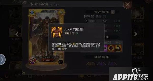 天·所向披靡-3气—强化全体吴国部队24%物攻,若是枪兵则额外增加40%物防,若是弓兵,则额外增加一个护盾,持续25秒