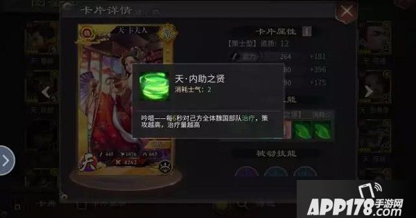 天·内助之贤-2气—吟唱——每6秒对己方全体魏国部队治疗,策攻越高,治疗量越高
