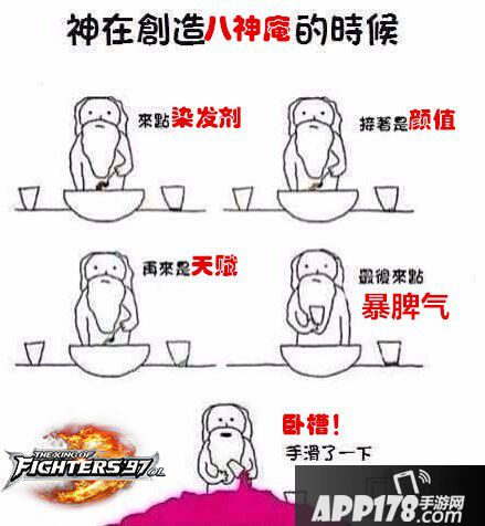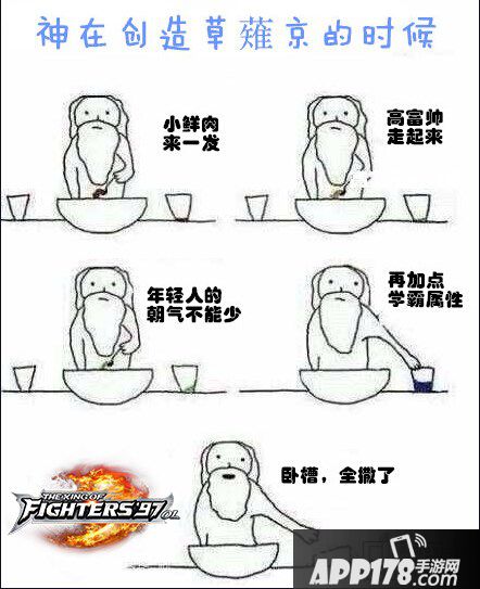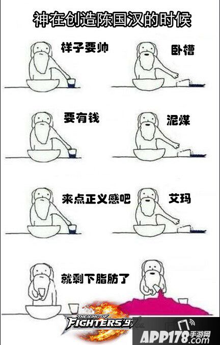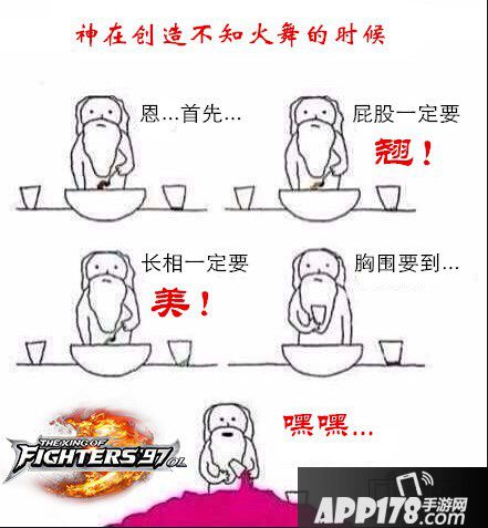 《拳皇97》中的人物各具个性,每个格斗家都有自己代表性的标签。帅气、狂暴、肥硕、娘炮,等不同的特点都有着专属代言人。比如一提到火辣就让人想到不知火舞,而一提到“猪”就让人想到陈国汉。这种标志性元素,不禁让我们脑洞大开,在神创造出他们的时候,会是怎么样的情形呢?